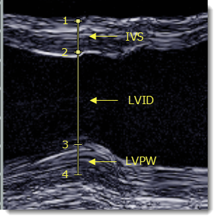 Χρησιμοποιήστε το εργαλείο Απόσταση LV για να μετρήσετε το μεσοκοιλιακό διάφραγμα (IVS), την εσωτερική διάσταση αριστερής κοιλίας (LVID) και το πάχος οπίσθιου τοιχώματος αριστερής κοιλίας (LVPW) σε εικόνες υπερηχογραφήματος M-mode.