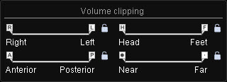Η ρύθμιση των επιπέδων αποκοπής μπορεί να αλλάξει την ορατή περιοχή ενός όγκου 3D. Η αποκοπή πραγματοποιείται κατά μήκος των αξόνων προσανατολισμού ασθενούς (A-P, H-F, R-L).